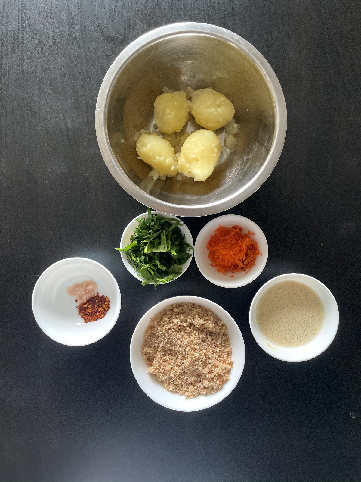 ready to be mashed. Add in the salt, grated carrot, spinach, onion ,red chilli powder and mix well together. and Try to get the mashed potatoes as smooth as possible.